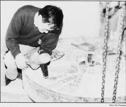 Dressing the runnerstone. A chain hoist has been used to lift it from its position above the bedstone. Peter Dolman, Secretary of the Suffolk Mills Group, is the “dresser”.