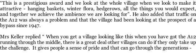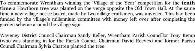 ‘Village of the Year’ Presentation 2004 Parish Councillors Stanton and Geoffrey Sallows and John Liddell look on Chairman of Waveney District Council Sandy Kellor with the newly planted tree Tony Kemp, SCC & WDC Wendy Mawer, Parish Councillors Gwyneth Jebson and Cliff Woods and a member of Waveney District Council WDC Chairman Sandy Kellor,  SCC & WDC Councillor Goldsmith, Mrs Sylvia Chatten, Tony Garner and   a member of Waveney District Council Mr Kemp said “We have always had a good community spirit here - we never find it difficult to get people involved to make a good show for the awards.” and if everyone takes up that pride we would have a little less vandalism around”. Waveney Village of the Year Plaque The Tree in 2009 Click to go back to Home page