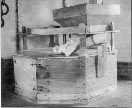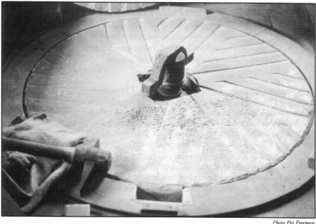 The stones, weighing up to three quarters of a tonne or more each, worked in pairs or sets, consisting of a lower fixed bedstone and a runnerstone immediately above it and both were enclosed in a wooden casing or 'vat'. A driving spindle passed upwards through the centre of the bedstone and engaged in an iron fixture which was mounted across the central opening, or eye, of the runnerstone. This could therefore be made to revolve by the action of the spindle, and its height above the bedstone, which was very small, could be carefully controlled to suit the type of grain being ground.