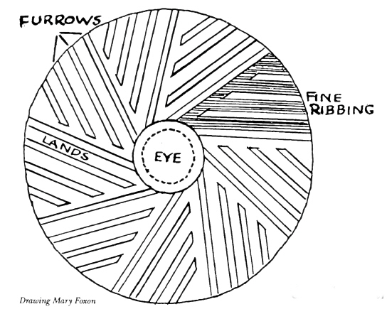 Stone dressing was carried out at intervals either by the miller or by an itinerant specialist. The tools used consisted of an iron chisel (the bill) mounted in a wooden handle (the thrift) and a suitable length of wood to check the flatness across the face of the stone. Dressing stones was a skilled job and it was often said that a handshake from a stone dresser immediately disclosed his trade as the back of his hand carried embedded steel particles which had splintered off the bill. The author can vouch for this as his father, a miller by trade, who did his own dressing, had the back of his hands almost black.